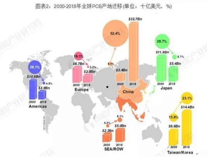 PCB产业在世界范围内广泛分布,欧美发达国家起步早,研发并充分利用先进的技术设备,故PCB行业得到了长足发展。近二十余年,凭借亚洲尤其是中国在劳动力、资源、政策、产业聚集等方面的优势,全球电子制造业产能向中国、中国台湾和韩国等亚洲地区进行转移。