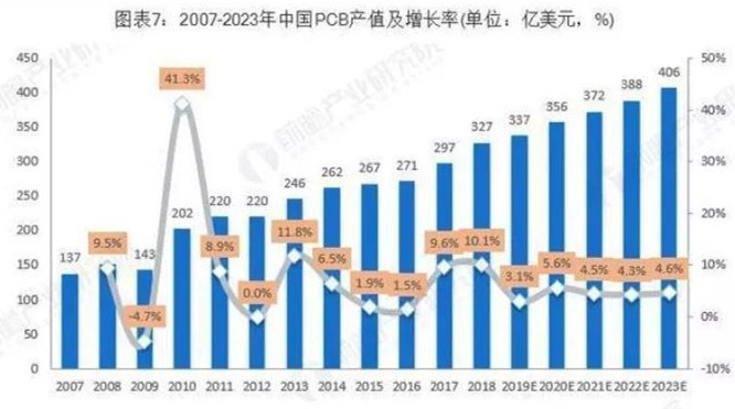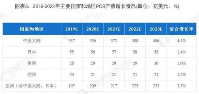 据Prismark预测,未来5年亚洲将继续主导全球PCB市场的发展,而中国的核心地位更加稳固,中国大陆地区PCB行业将保持4.4%的复合增长率,至2023年行业总产值将达到405.56亿美元。在PCB公司"大型化、集中化"趋势下,已较早确立领先优势的大型PCB公司将在未来全球市场竞争中取得较大优势。