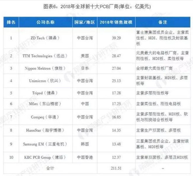 全球印刷电路板行业集中度不高,生产商众多,市场竞争充分。虽然目前PCB行业存在向优势企业集中的发展趋势,但在未来较长时期内仍将保持较为分散的行业竞争格局。根据N.T.Information发布的2018年世界百强PCB企业排行榜,2018年前十大PCB厂商收入合计为211.51亿美元。2018年全球前十大PCB厂商的销售情况如下: