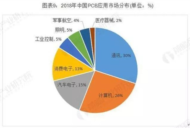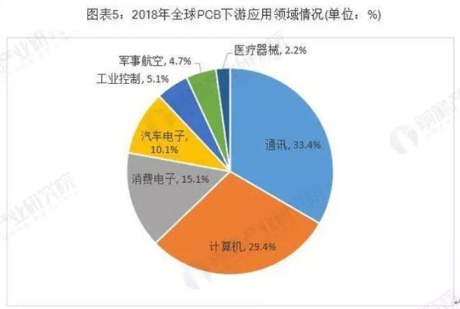 全球PCB下游应用市场分布广泛,主要包括通讯、计算机、消费电子、汽车电子、工业控制、军事航空、医疗器械等领域。根据Prismark的统计,2018年全球PCB下游应用领域分布如下:
